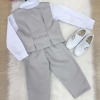Conjunto Social Infantil Colete – Elegância e Estilo em Cada Detalhe Um look clássico e sofisticado para os pequenos arrasarem em ocasiões especiais! Este conjunto social é composto por camisa branca manga longa, gravata borboleta cinza, colete cinza, calça cinza e cinto, formando uma combinação perfeita de elegância e conforto. Perfeito para eventos como batizado, casamento, pajem, florista, formatura, ensaio fotográfico e festas especiais. Detalhes do produto: Camisa social branca manga longa (microfibra 100% poliéster); Colete e calça em tecido Twill Premium (100% poliéster), com excelente caimento; Gravata borboleta e cinto inclusos; Modelagem confortável e acabamento impecável; Ideal para eventos formais e momentos marcantes. Atenção: Calçados e demais acessórios vendidos separadamente; Produto delicado: recomendamos lavagem à mão com sabão neutro; Tonalidade pode variar de acordo com o lote; As medidas podem variar em até 2cm. Recomendamos sempre consultar a tabela de medidas antes da compra para evitar erros. As cores do produto podem sofrer variações de tonalidade conforme a configuração da tela do seu dispositivo.