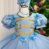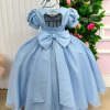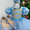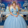Vestido/Fantasia Infantil Cinderela Luxo Azul  Um verdadeiro conto de fadas em forma de vestido! Este modelo encantador é inspirado na clássica princesa Cinderela e foi criado para fazer qualquer menina se sentir uma verdadeira realeza. Com saia armada em camadas de tule cintilante, o vestido ganha movimento e brilho a cada passo. O corpete possui fitas douradas cruzadas que formam um lindo detalhe frontal, enquanto as rosas de cetim aplicadas nas mangas bufantes e cintura adicionam um toque delicado e romântico.  Destaques: Modelo princesa inspirado na Cinderela Rosas de cetim azul e fitas douradas Tule com leve brilho e acabamento refinado Ideal para festas, aniversários e ensaios fotográficos   Informações Importantes As medidas podem variar em até 2cm. Recomendamos sempre consultar a tabela de medidas antes da compra para evitar erros. Tecido Tecnosport 100% poliester Para um volume extra, indicamos o uso de saiote de armação, vendido separadamente na categoria Acessórios. Tiara e outros acessórios não acompanham o produto, mas estão disponíveis em nosso site. Calçado vendido separadamente, disponível na categoria Calçados As cores do produto podem sofrer variações de tonalidade conforme a configuração da tela do seu dispositivo.