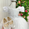 Coleção Babadinho – Enjoy LongoEssa coleção é puro encanto e delicadeza.Perfeito para ocasiões especiais como batizados, daminhas de casamento, festas formais e momentos únicos que merecem um look inesquecível.Um modelo clássico e atemporal, que transmite leveza e pureza em cada detalhe. Ideal para deixar sua princesa ainda mais especial em momentos inesquecíveis Detalhes Importantes Corpo estruturado com bordados discretos em pedraria que trazem sofisticação; Mangas bufantes que adicionam romantismo e charme; Saia longa com camadas de tule suave, garantindo volume e movimento; Cintura marcada com faixa delicada em fita, destacando ainda mais a silhueta infantil;   Informações Importantes As medidas podem variar em até 2cm. Recomendamos sempre consultar a tabela de medidas antes da compra para evitar erros. Para um volume extra, indicamos o uso de saiote de armação, vendido separadamente na categoria Acessórios. Tiara e outros acessórios não acompanham o produto, mas estão disponíveis em nosso site. Calçado vendido separadamente, disponível na categoria Calçados As cores do produto podem sofrer variações de tonalidade conforme a configuração da tela do seu dispositivo.